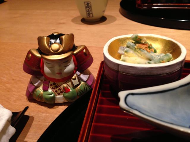 5月人形はふたをとると、サヤエンドウのごま和えが盛りつけ
